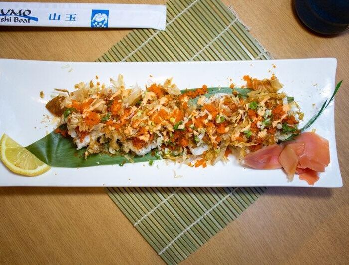 Crab, avocado, spicy tuna, macadam nut, topped with spicy mayo and bonito.